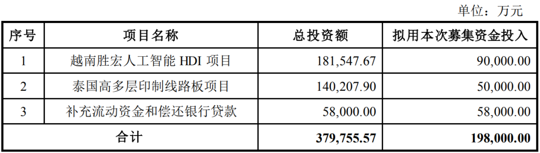 11月8日,勝宏科技(300476.SZ)發(fā)布公告顯示,公司為滿足公司業(yè)務(wù)發(fā)展的資金需求,增強(qiáng)公司資本實(shí)力,擬向特定對(duì)象發(fā)行股票,擬募集資金總額不超過(guò)198,000.00萬(wàn)元,扣除發(fā)行費(fèi)用后的募集資金凈額擬投資于越南勝宏人工智能HDI項(xiàng)目、泰國(guó)高多層印制線路板項(xiàng)目及補(bǔ)充流動(dòng)資金和償還銀行貸款。根據(jù)公告,越南勝宏人工智能HDI項(xiàng)目預(yù)計(jì)總投資181,547.67萬(wàn)元,擬使用募集資金90,000.00萬(wàn)元,建設(shè)期3年,第三年開始分步投產(chǎn),至第五年全部達(dá)產(chǎn)。本項(xiàng)目的實(shí)施主體為全資子公司VICTORY